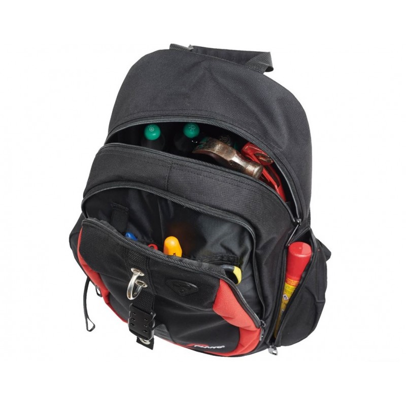 ZAINO PORTAUTENSILI A DOPPIA APERTURA TASCHE PER TABLET, CAVI E MINUTERIE. 12 TASCHE PORTAUTENSILI, SCHIENALE IMBOTTITO TRASPIRANTE, SPALLACCI IMBOTTITI REGOLABILI, MATERIALE: POLIESTERE, DIMENSIONI: 360X290X510MM.Destinatario :